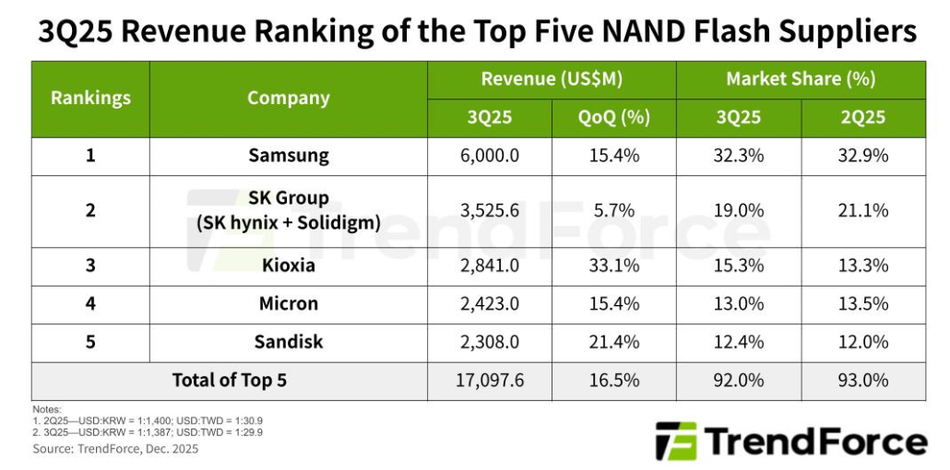 TrendForce’s recent research indicates that the ongoing expansion of AI infrastructure by CSPs fueled strong demand for enterprise SSDs in 3Q25. As a result, the combined revenue of the top five NAND Flash vendors grew by 16.5% QoQ, approaching $17.1 billion. The production cuts enacted earlier in the year are now impacting the market, helping to balance supply and demand in the latter half. Additionally, the rising proportion of enterprise SSD shipments contributed to increased ASPs among suppliers. A forecast for 4Q25 indicates that demand driven by AI for high-performance TLC and QLC enterprise SSDs will keep growing. However, as suppliers’ inventories normalize and node migrations cause typical yield-related losses, the growth in shipments will be more restrained. Ongoing shortages in HDD supply will continue to push NAND Flash prices upward. TrendForce predicts total NAND Flash prices will rise by 20–25%, further boosting quarterly revenue.